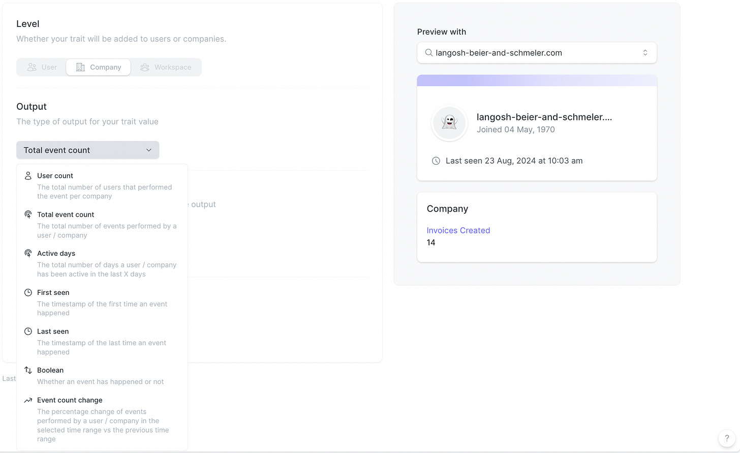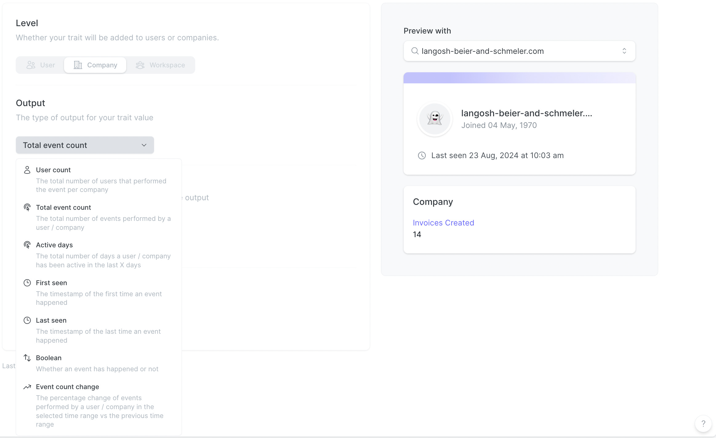 Here’s an example of how product analytics tool June.so enables users to create computed traits based on events.